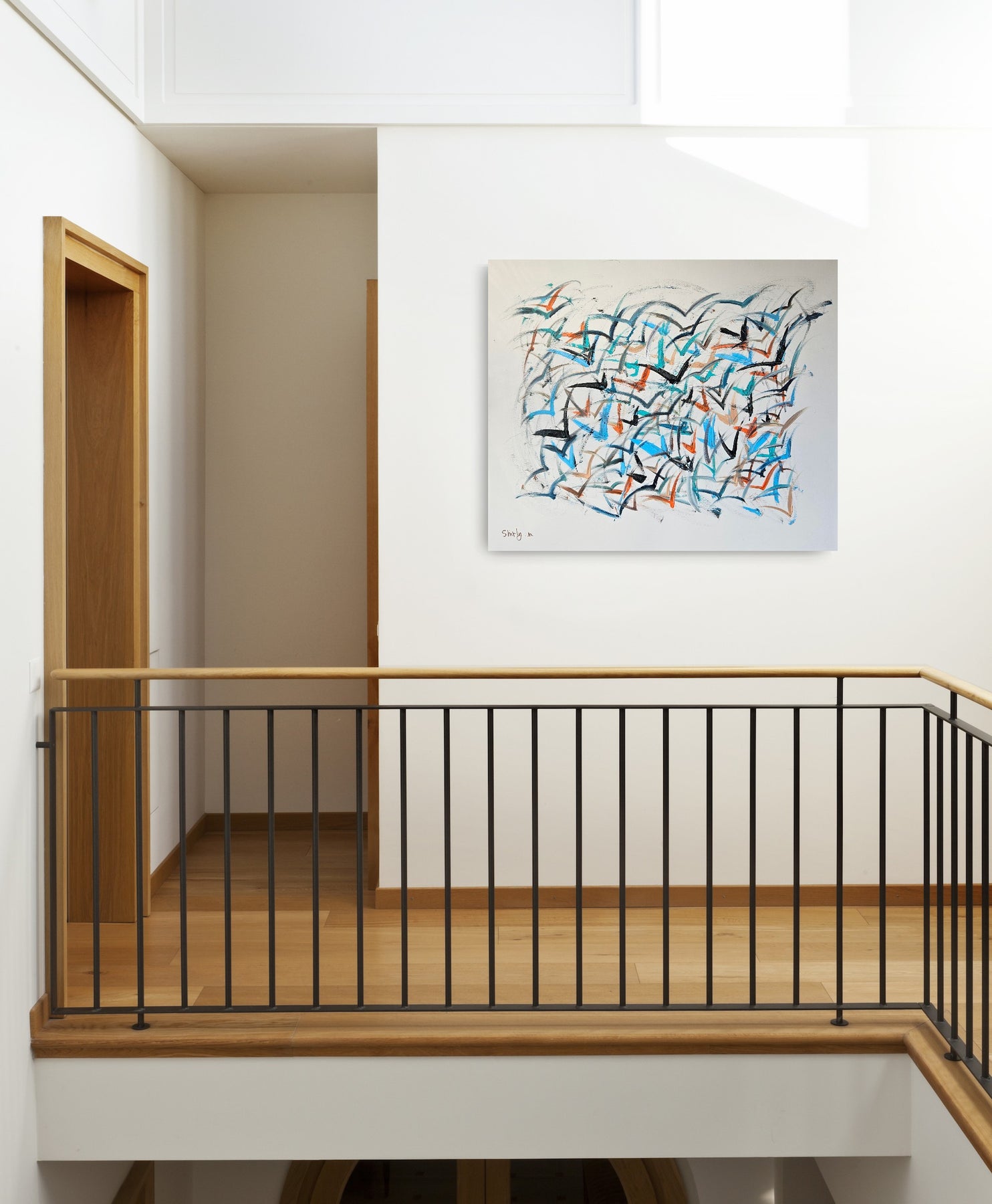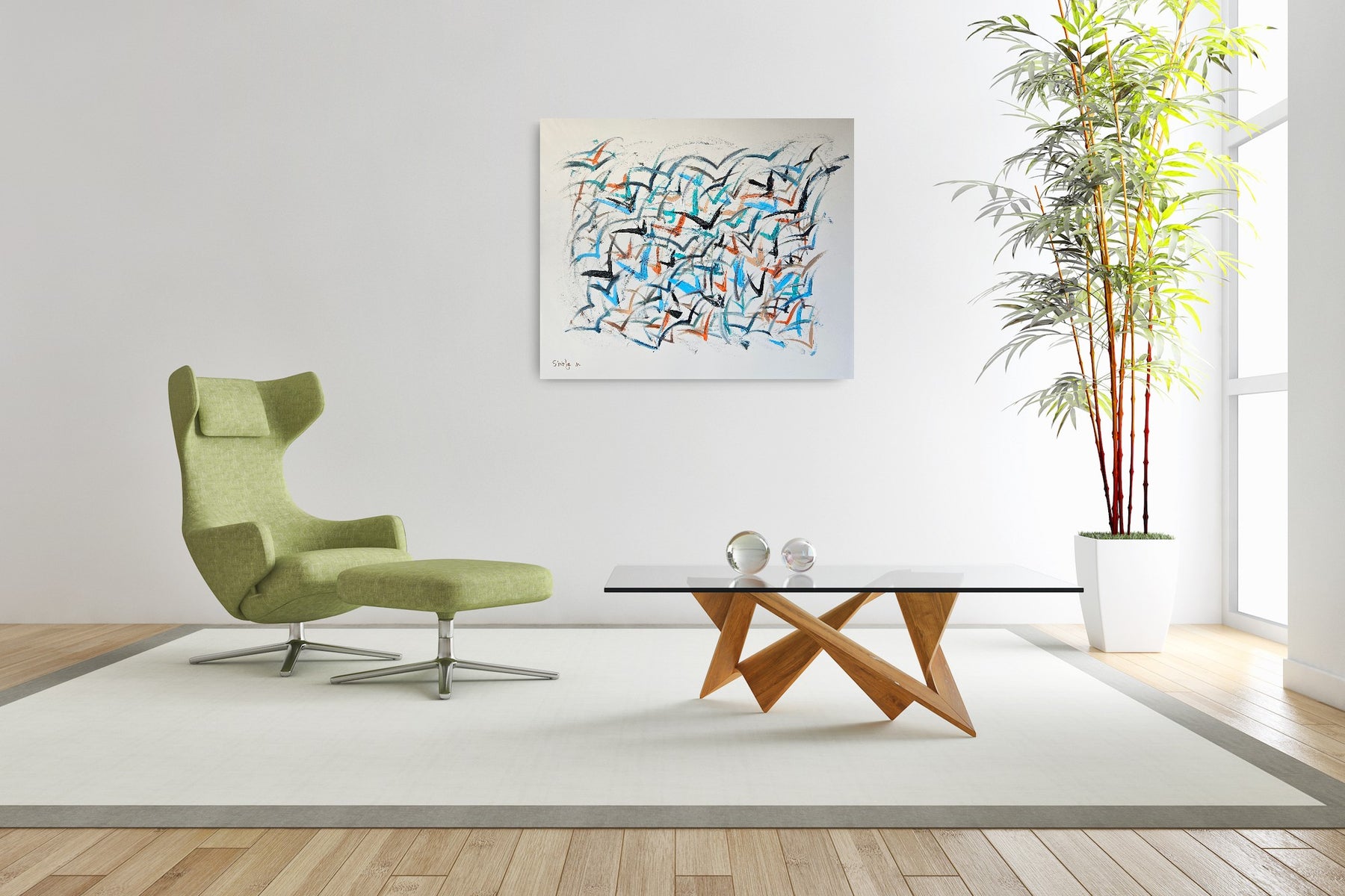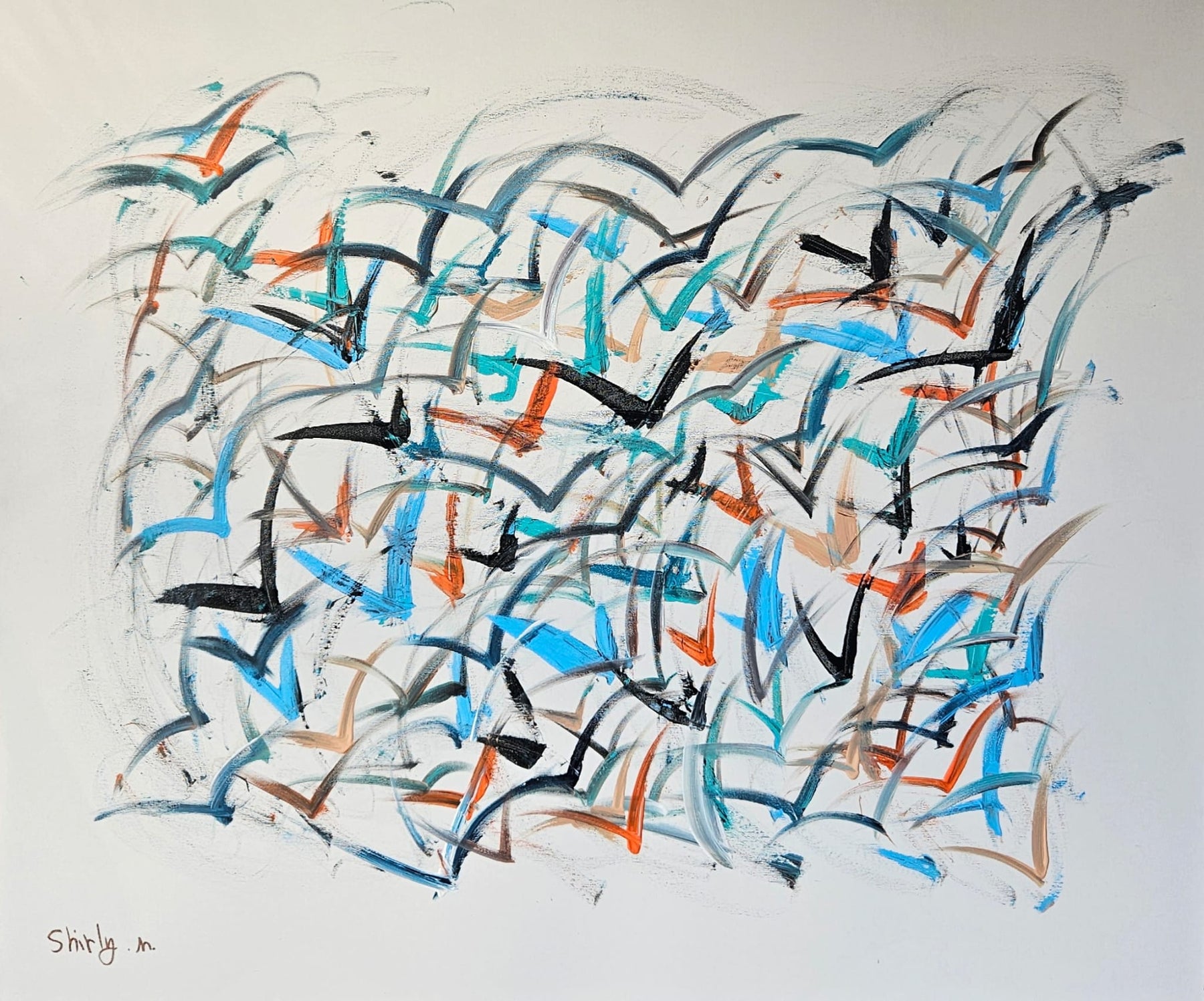 In this painting every movement reminds me of a bird in flight. One chooses to soar quickly ahead another drifts sideways and some remain slightly behind. Each line carries its own personal journey yet together they form a flock a harmonious motion greater than the details themselves.