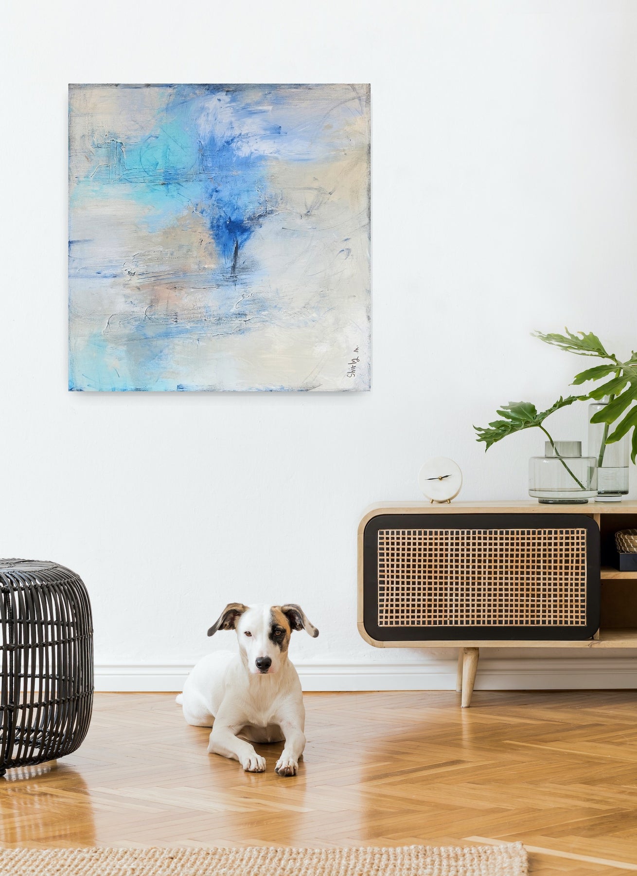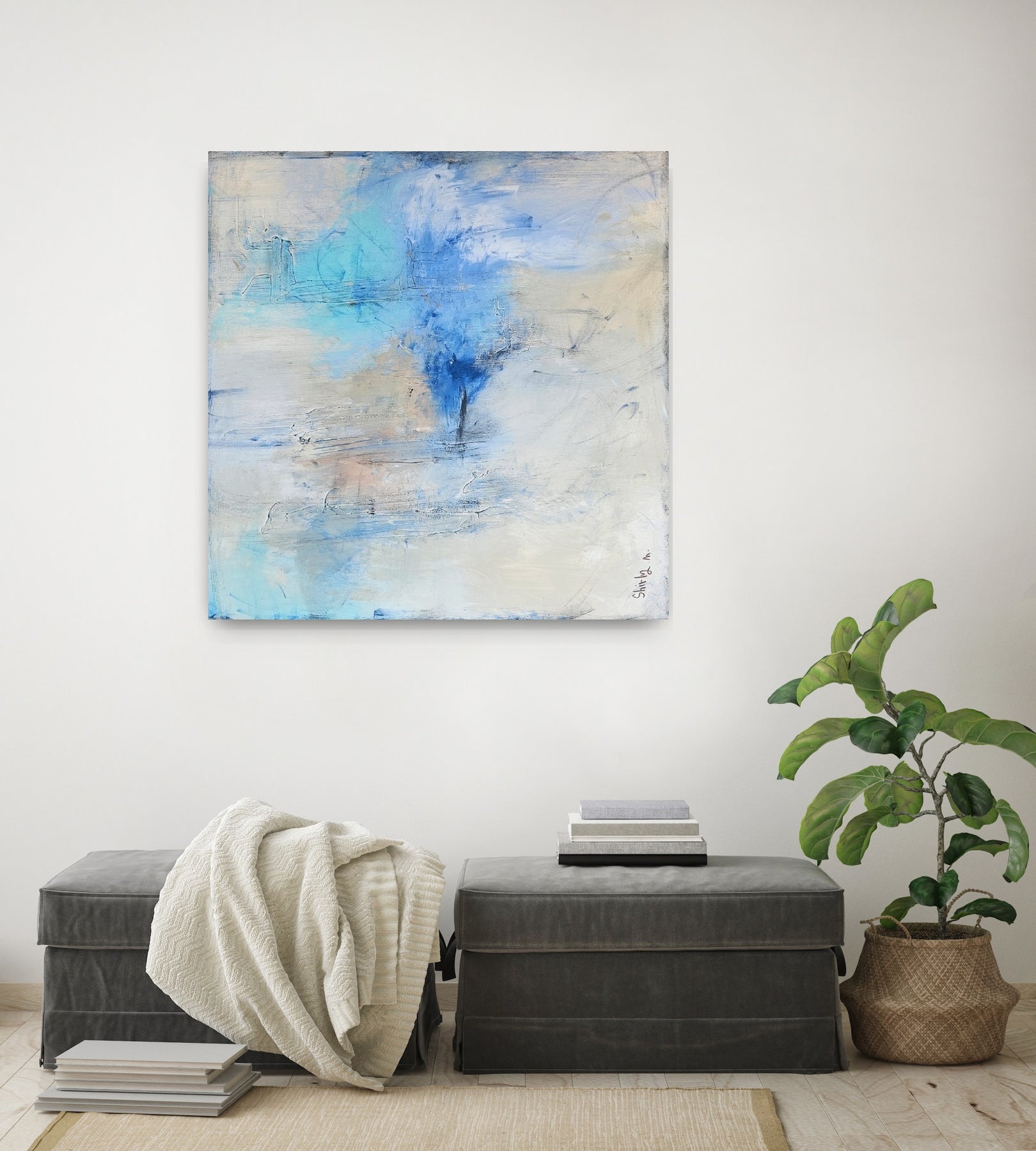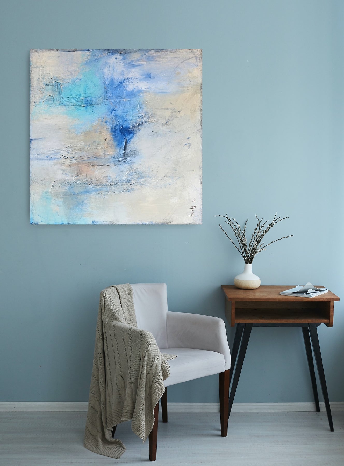While painting, I felt I was touching the deepest layers of my own consciousness, the places the eyes cannot see but the heart knows well. Each sweep of color felt like digging inward, revealing another layer, another fine line of understanding. The soft blue tones wrap everything in quiet, reminding me of the inner space where thoughts settle and become clear.