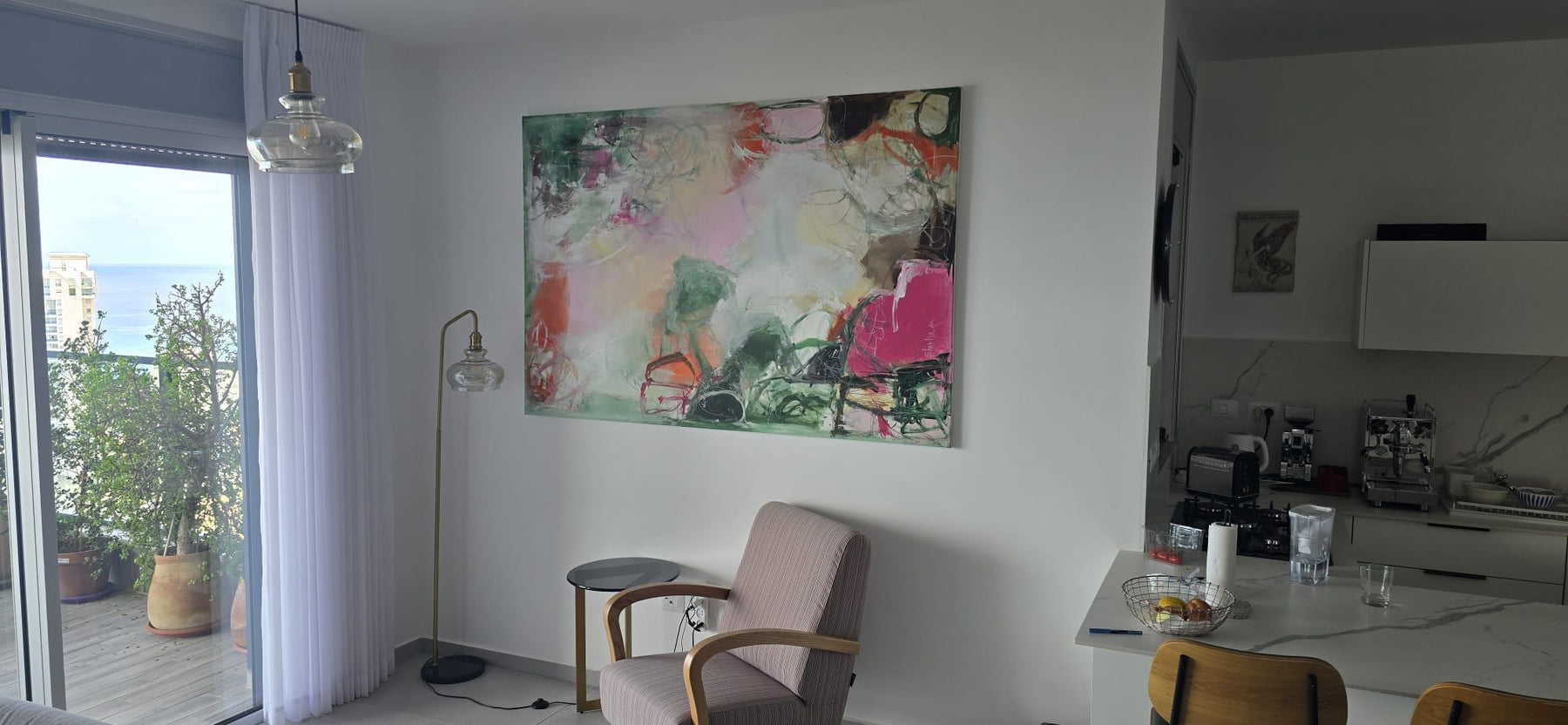 This painting was born from the understanding that in order to hear ourselves, we must create room. We must allow things to become clear, to make space for breath. Just like in this piece—not everything is filled, not everything is overwhelming. There are layers of color resting upon one another, but also open areas where air flows freely, where things remain spacious and unrestrained.