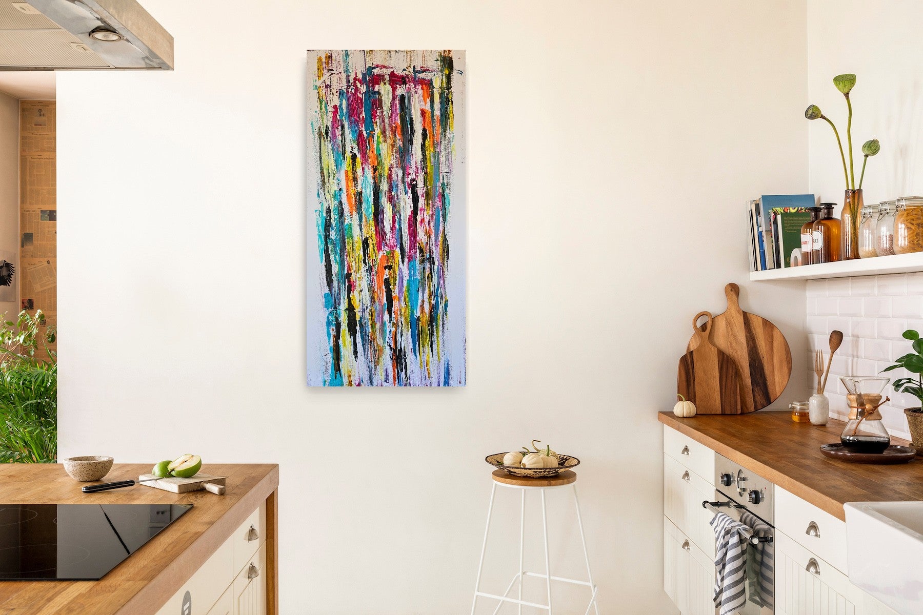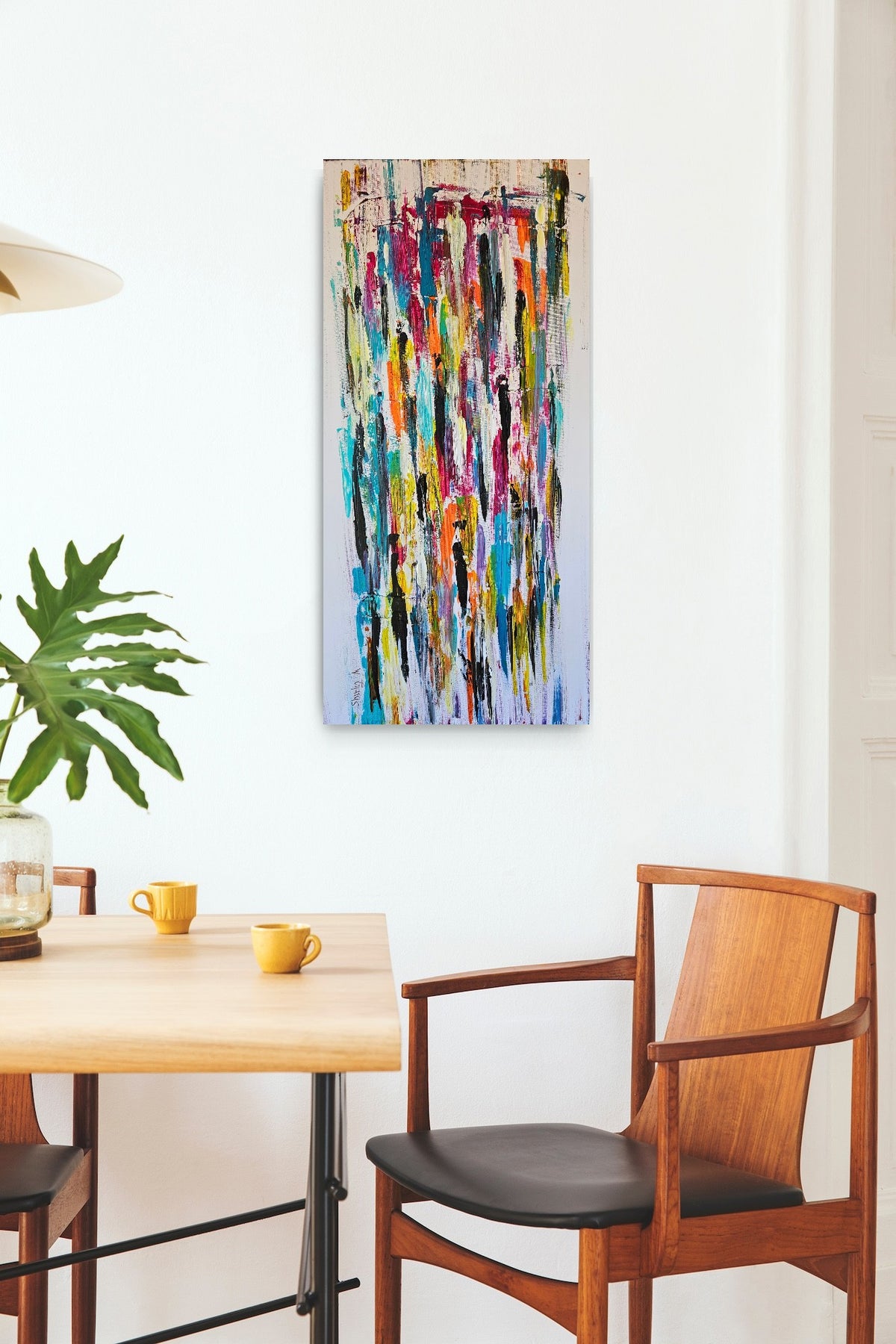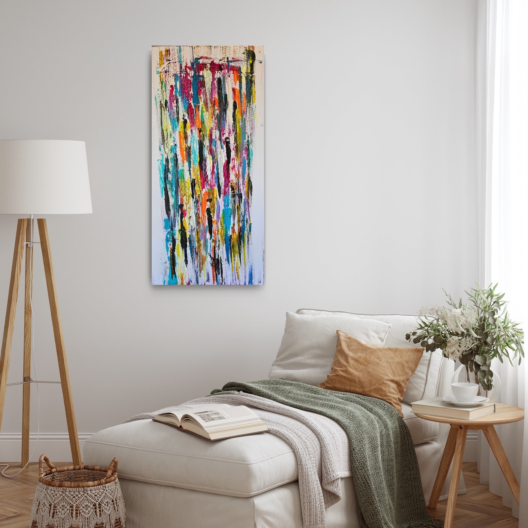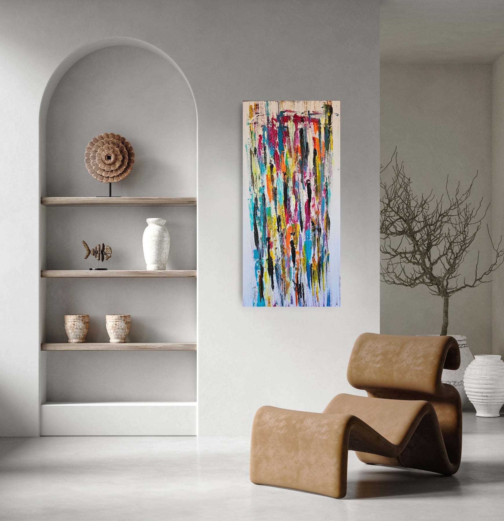 In this painting, layers of color come together like layers of human life. Every line hints at a moment, every mark carries an experience, and each new layer hides yet also reveals what came before it. Just like people – we are not made of a single clear picture, but of countless moments that together shape our identity.
